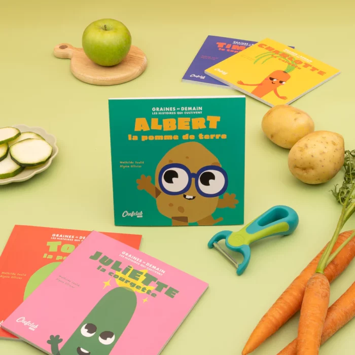 Et si les fruits et légumes devenaient les héros préférés des enfants ? Avec le coffret Graines de Demain, les enfants passent de l’inspiration à l’action ! Les enfants découvrent les histoires passionnantes de 5 fruits et légumes et apprennent à mieux les connaître. Et ce n’est pas tout : grâce à l’Éplucheur Kids, spécialement conçu pour leurs petites mains, les enfants passent aussi en cuisine en toute sécurité !