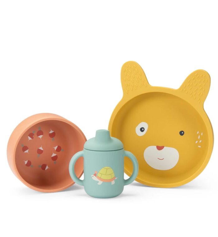 Coffret vaisselle en silicone, tendrement illustré pour manger comme les grands. Comprend bol, tasse à anses et assiette. Passe au lave-vaisselle