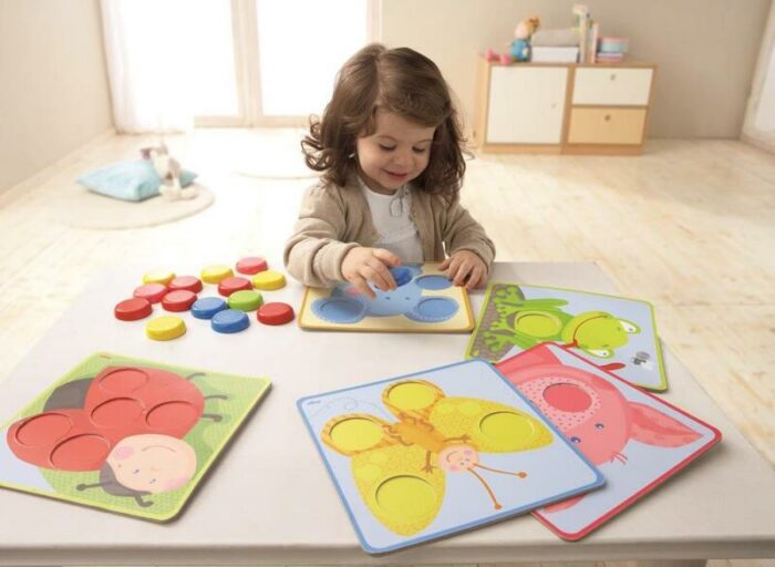 Quelle est la couleur des oreilles de la souris ? Quelles plaquettes doit-on poser pour les ailes du papillon ? Les enfants classent les couleurs en posant les plaquettes dans les découpes des plateaux. Ils peuvent bien sûr aussi parer les animaux de gros points multicolores.