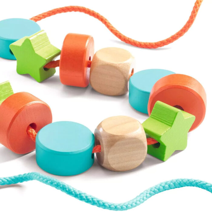 C’est un très bon choix d’offrir des grosses perles à enfiler à un enfant de 2 ans. J’ai remarqué qu’ils ont (presque) tous beaucoup de plaisir pour cette activité. Puis il y a le plaisir de se le mettre autour du cou ou de l’offrir à maman ! Ce kit avec 24 perles en bois est top ! Remarquez que les mêmes perles se répètent plusieurs fois et permettent donc de réaliser des suites ou des symétries.