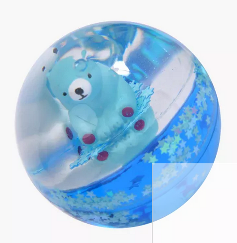 Balle rebondissante remplie de liquide coloré, où l’on voit un animal se baigner au milieu d’étoiles brillantes !