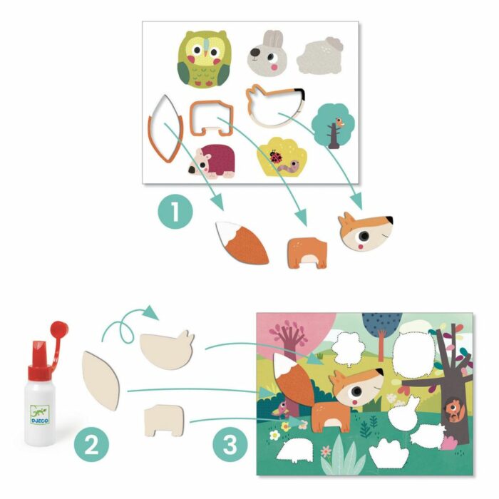 Une dizaine de formes à coller pour réaliser un tableau, et 4 tableaux à faire. Une activité créative pour les tout-petits.
