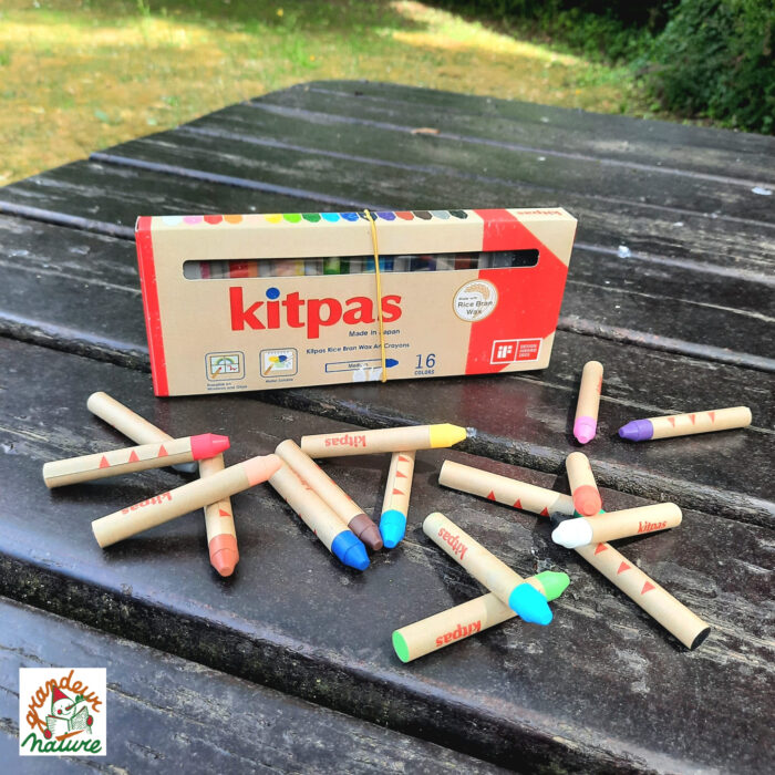 Coffret de 16 crayons de cire aux couleurs intenses. Les crayons Kitpas peuvent être utilisés sur différentes surfaces : papier, miroir, verre, tableau blanc type « velleda »… ! Les dessins sur surfaces non poreuses peuvent être facilement effacés à l’aide d’un chiffon humide, ce qui en fait un choix idéal pour le dessin sur les fenêtres. Les crayons sont aquarellables, avec un peu d’eau les pigments se dispersent et transforment votre dessin en aquarelle. Fabriqués au Japon.