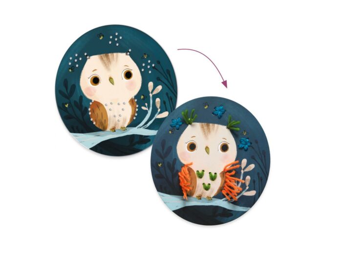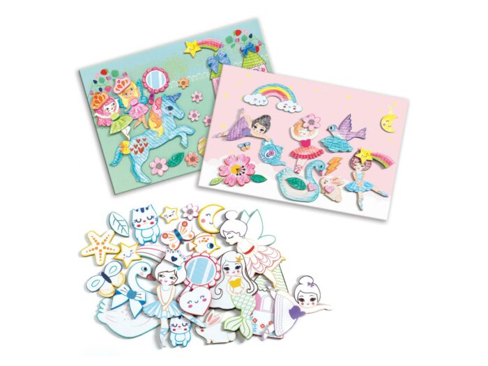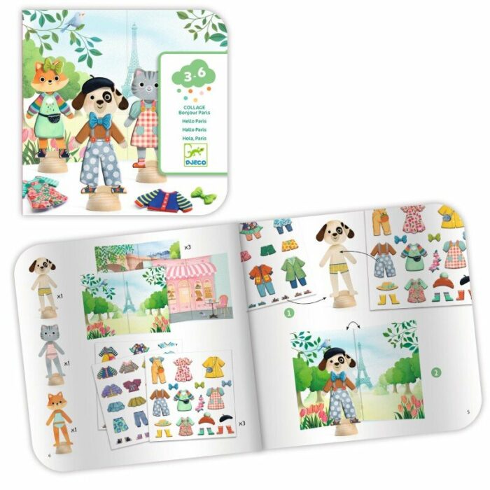 3 adorables animaux en bois et pleins d’habits en épais stickers à coller et recoller selon son envie. Les décors et les socles sont dans la boite.