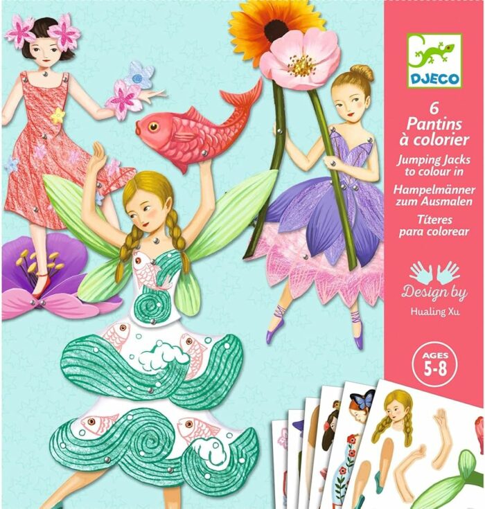 On colorie, puis on assemble avec des attaches parisiennes, et cela devient des pantins animés avec lesquels il est rigolo de jouer.