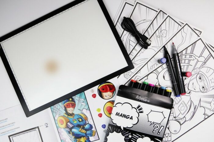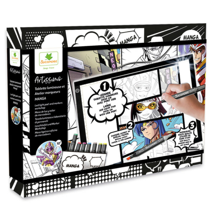 Avec cet atelier Artissimo, crée tes propres manga grâce à la tablette lumineuse XXL et aux marqueurs sur papier layout.