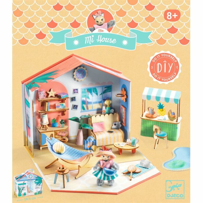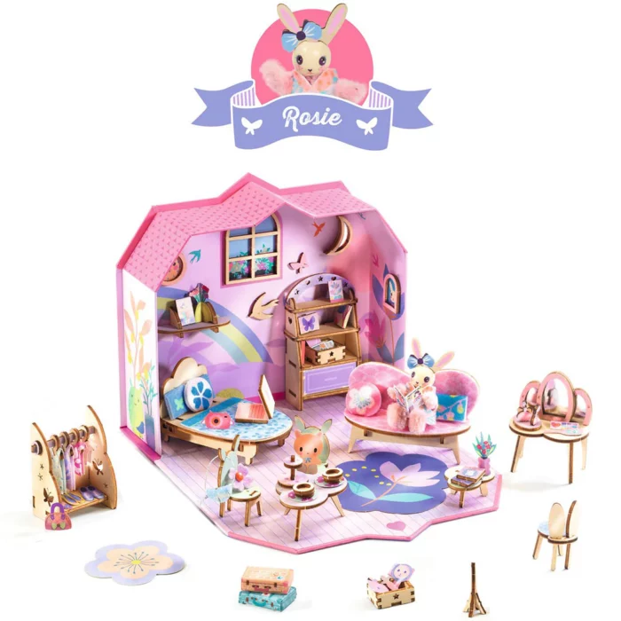 → du mobilier en bois à assembler, des éléments pour créer son personnage, de la feutrine toute douce, de la peinture avec son pinceau, des autocollants… bref, tout pour donner vie à un univers miniature plein de magie