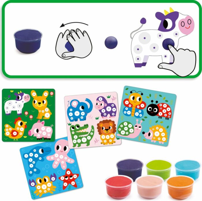 Quelques gouttes de peinture… pour colorer les animaux avec les doigts. Magique, de petits motifs apparaissent ! L’enfant place les autocollants pour rendre les animaux encore plus beaux !