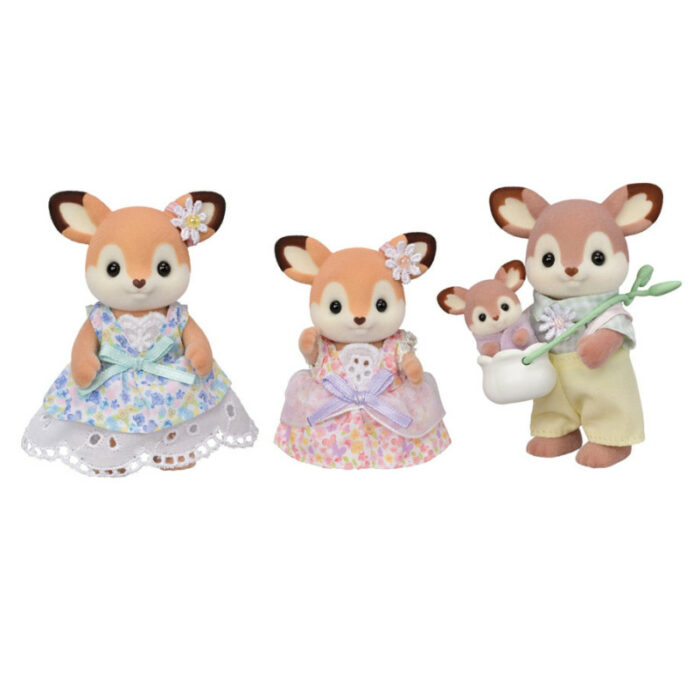 1 figurine maman Biche, 1 figurine papa Biche, 1 figurine fille Biche, 1 figurine bébé Biche (format nouveau-né), 1 porte-bébé