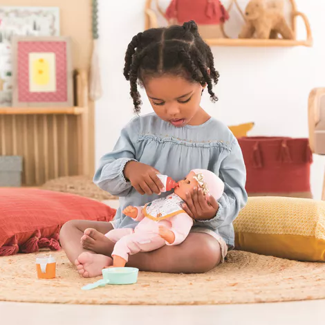 Contenu : 1 valise, 1 poupon de 32 cm (corps souple en tissu et tête, bras et jambes en vinyle)., 1 pyjama, 1 bonnet, 1 haut cache-cœur, 1 bloomer, 1 paire de chaussons, 1 couche, 1 lingette, 1 biberon, 1 bavoir.