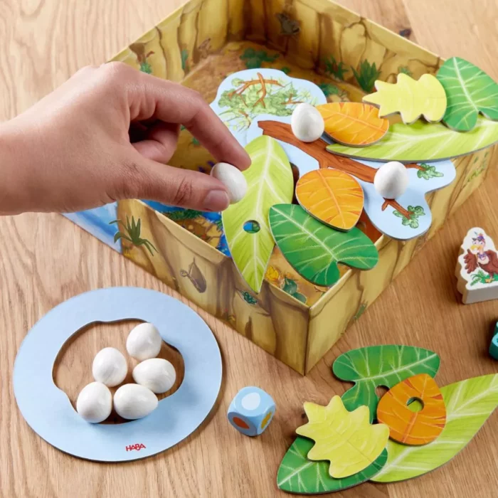 Piochez une carte, reproduisez ensemble l’action indiquée et placez la carte sur l’arbre. Bougez, sautez, attrapez la banane… et partagez tout plein de moments de jeux remplis de tendresse et de complicité !