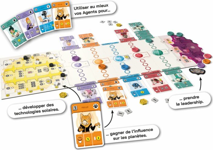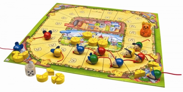 Si une souris réussit à faire un tour de plateau, elle empoche un fromage entier, mais attention, deux côtés du dé font avancer le chat d’une case et si celui-ci rattrape ou dépasse les souris, il les mange ! En plus, dès que le chat a effectué un tour du plateau, il avance de deux cases à chaque fois.