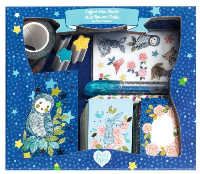 Un mini coffret de papeterie aux belles illustrations. Les écrivains en herbe aimeront y noter idées et pensées, ou dessiner et décorer avec les stickers. Lovely Paper by Djeco, une collection de papeterie raffinée et délicate aux jolies illustrations.