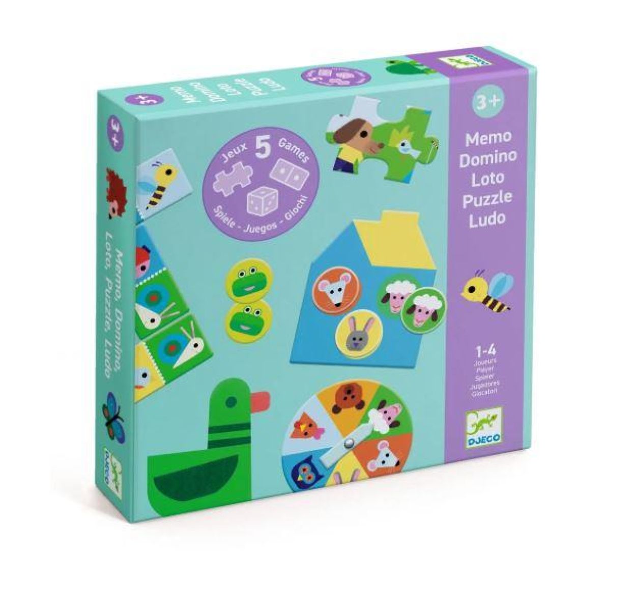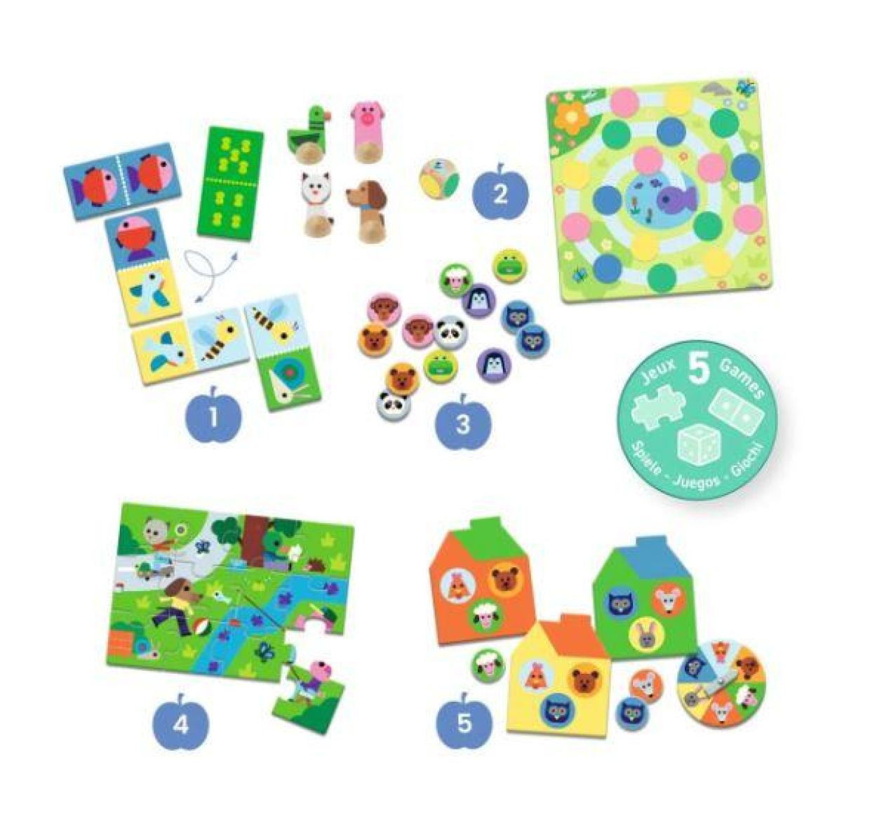 Ensemble de 5 jeux sur le thème de la ferme: memo, domino, loto, puzzle et ludo.