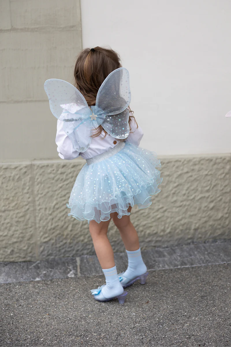 Un trio onirique pour des moments magiques. Cet ensemble enchanteur comprend un tutu bleu clair superposé orné d’étoiles argentées scintillantes, idéal pour virevolter et virevolter au fil des aventures. Les ailes de fée assorties sont époustouflantes : bleu clair et ornées d’étoiles argentées flottantes qui scintillent et se transforment, créant un scintillement céleste envoûtant qui donne vie aux rêves de fées. Pour couronner le tout, une baguette magique assortie, ornée d’une grande étoile brillante en son centre, est enveloppée de volants en tulle bleu moelleux pour une touche ludique. Qu’ils jettent des sorts, dansent dans le jardin ou imaginent simplement l’impossible, cet ensemble est le parfait mélange d’émerveillement et de fantaisie.
