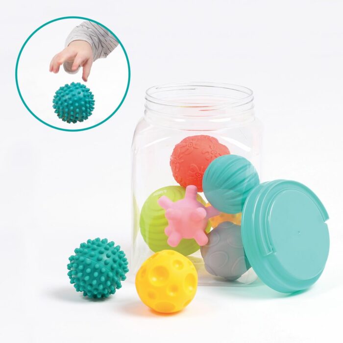 Lot de 8 petites balles aux couleurs vives et aux formes différentes, pour éveiller les sens de Bébé. Développent la dextérité et la motricité fine.