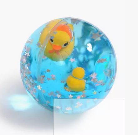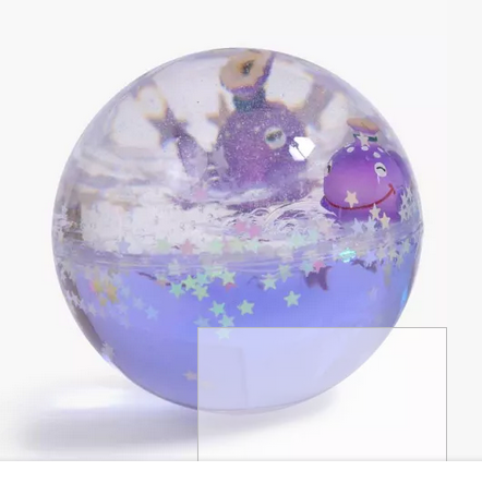 Balle rebondissante remplie de liquide coloré, où l’on voit un animal se baigner au milieu d’étoiles brillantes !
