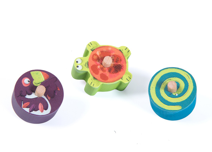 Et c’est parti ! Pose les toupies toucan, serpent et tortue au sommet d’un baobab et regarde-les dégringoler à toute vitesse.