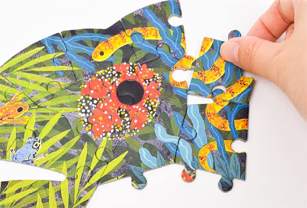 Tout l’art du puzzle est bousculé devant ce format inédit: plus de coins, plus de bordures. Une grande silhouette dessine un animal dans laquelle fourmille un monde imaginaire.
