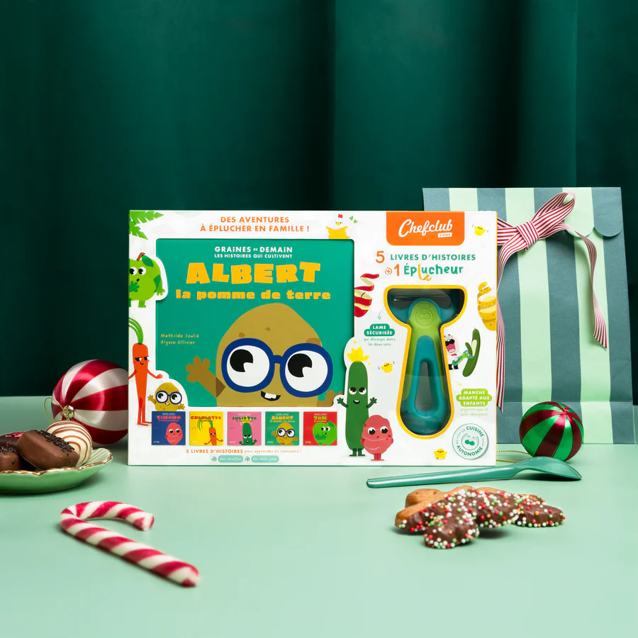 Et si les fruits et légumes devenaient les héros préférés des enfants ? Avec le coffret Graines de Demain, les enfants passent de l’inspiration à l’action ! Les enfants découvrent les histoires passionnantes de 5 fruits et légumes et apprennent à mieux les connaître. Et ce n’est pas tout : grâce à l’Éplucheur Kids, spécialement conçu pour leurs petites mains, les enfants passent aussi en cuisine en toute sécurité !