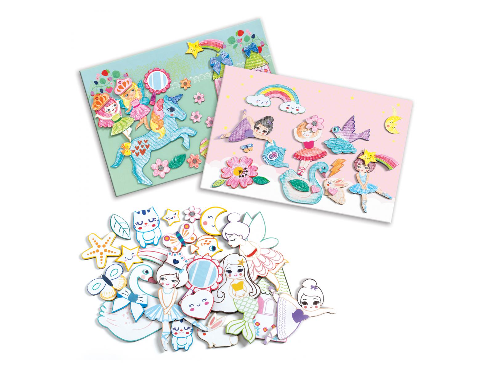 Une multitude de formes, de grands décors, 8 couleurs et de la colle, pour créer comme on veut. Le livret donnera des idées.