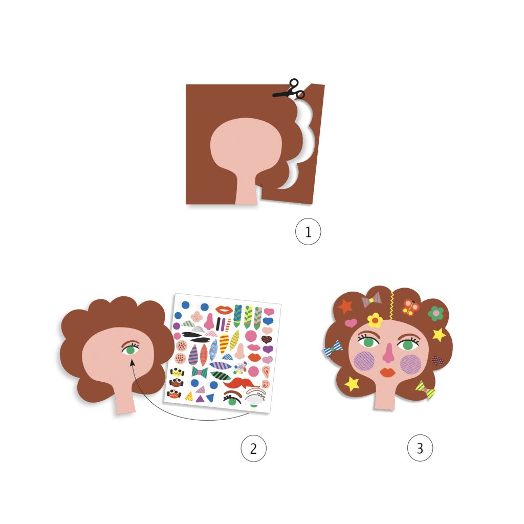 Avec les ciseaux fournis, on découpe d’abord les cheveux comme on veut, et c’est rigolo. On colle des stickers pour finir.