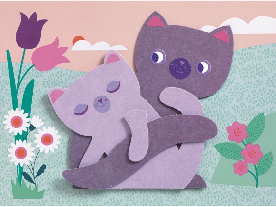 L’enfant assemble des papiers unis, colorés et épais. Il les colle sur des fonds illustrés et crée ces scènes pleines de tendresse.