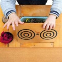Avec une cuisinière d’extérieur, pas besoin de fruits ou de légumes en bois ! On court dans le jardin et on cherche tout ce qui peut convenir: feuilles, herbe, terre, pierres,… Ceux-ci composeront le menu du jour