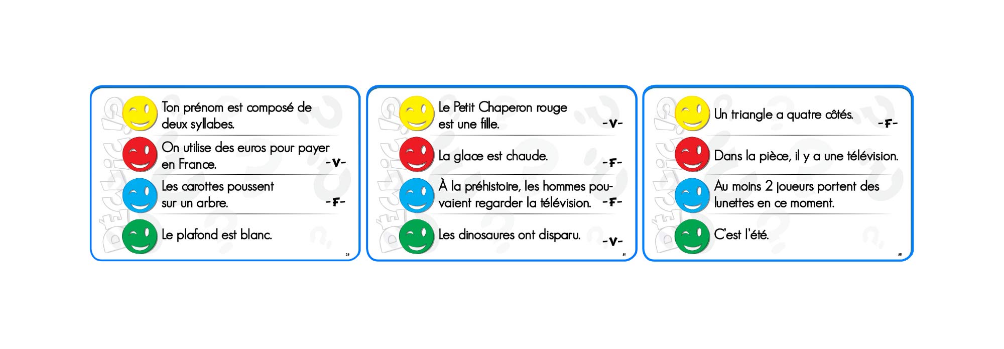 Jouez à déclic avec toute la famille ! Votre main droite dit vrai, la gauche dit Faux. Un joueur lit une des 360 affirmations ( Les coqs pondent des oeufs, tu as déjà porté des couches…). Soyez le plus rapide à répondre Vrai ou Faux, en tapant avec la bonne main sur la cible au centre de la table.