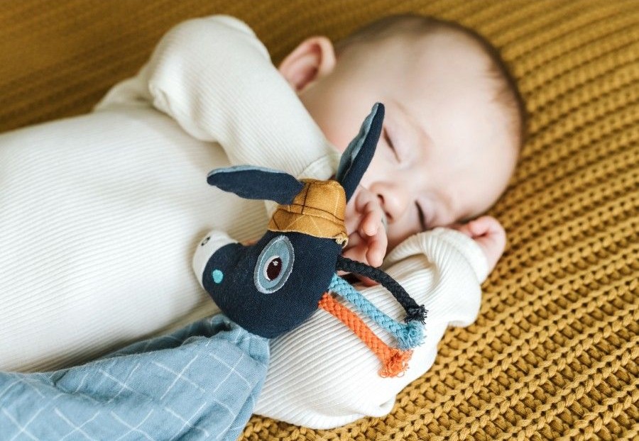 Ce doudou en coton biologique offre du réconfort aux plus petits. La petite tête est une marionnette à doigts et le petit nœud permet d’attacher la tétine.