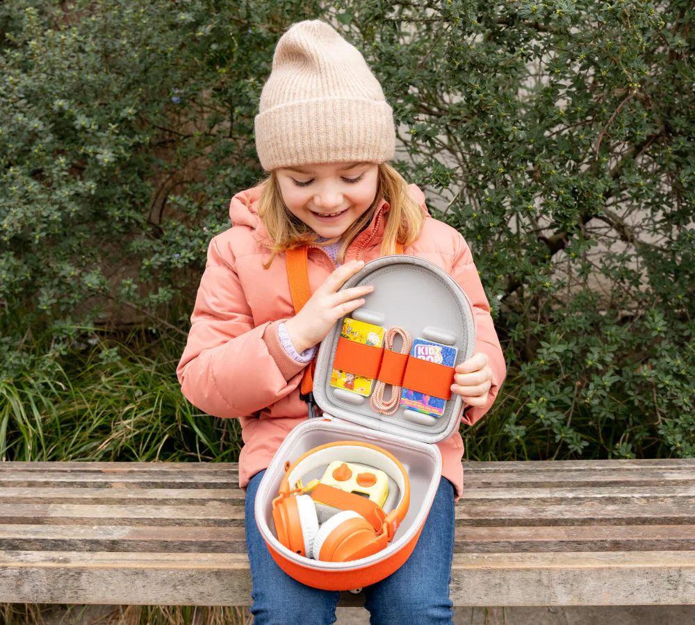 On peut y ranger un Yoto Mini, avec ou sans Adventure Jacket. Et en plus, il y a un petit trou pour le câble du casque, pour permettre aux enfants de s’amuser tout en gardant Yoto Mini bien protégé.