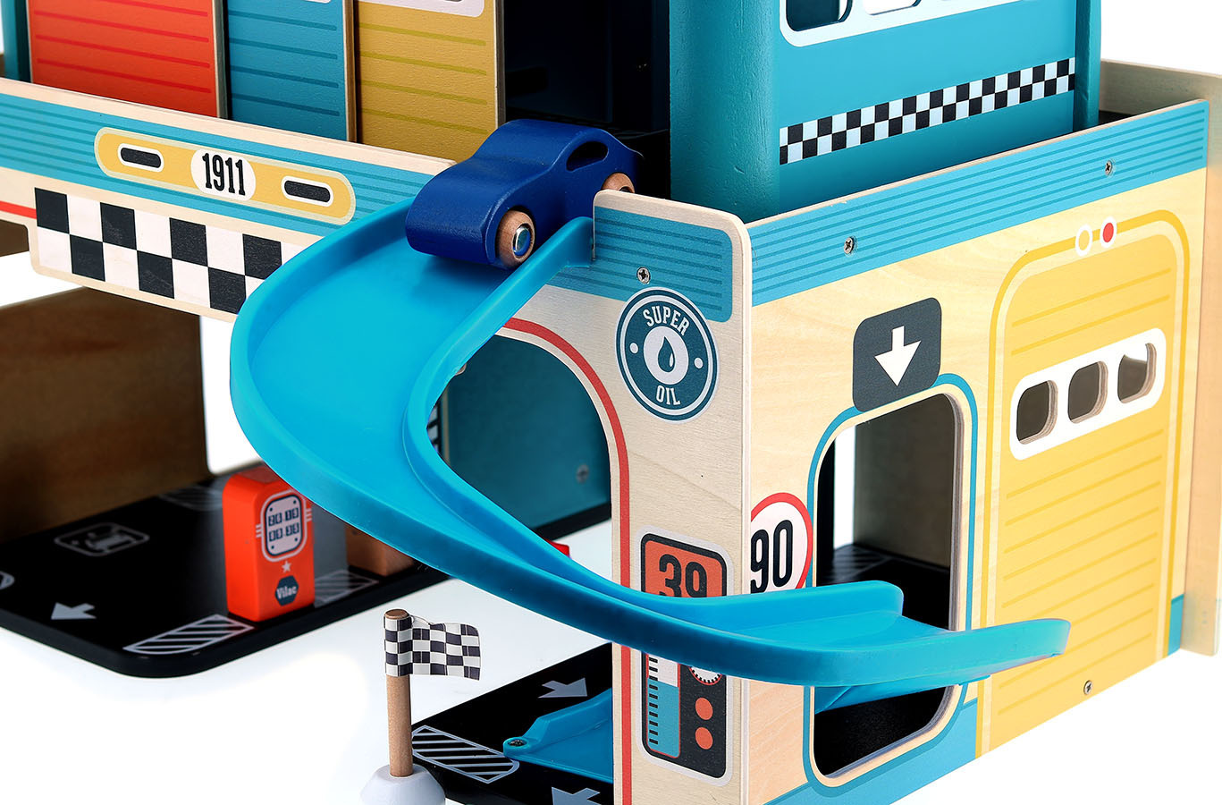 Avec ses larges portes coulissantes, son ascenseur pour voitures et ses accessoires, il saura ravir les petit(e)s pilotes. Ce garage a tout ce qu’il faut pour vivre de nouvelles aventures. Le petit plus ? La rampe en colimaçon pour accélérer et arriver sur le parquet en vitesse turbo !