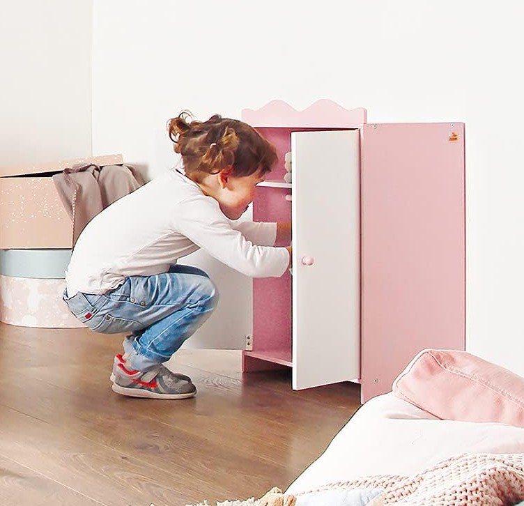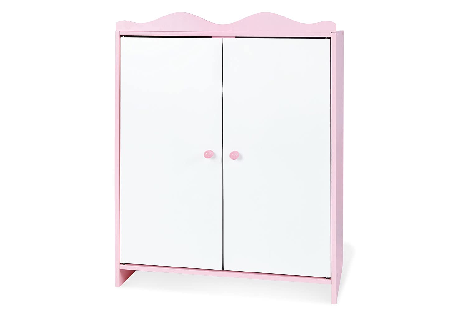 Armoire pour poupées « Jasmin », avec 2 portes, 1 étagère, 1 tringle à vêtements et 3 cintres, en MDF, peinte en rose et blanc, dimensions L 45 x l 27 x H 62 cm, poids 6 kg, montage nécessaire