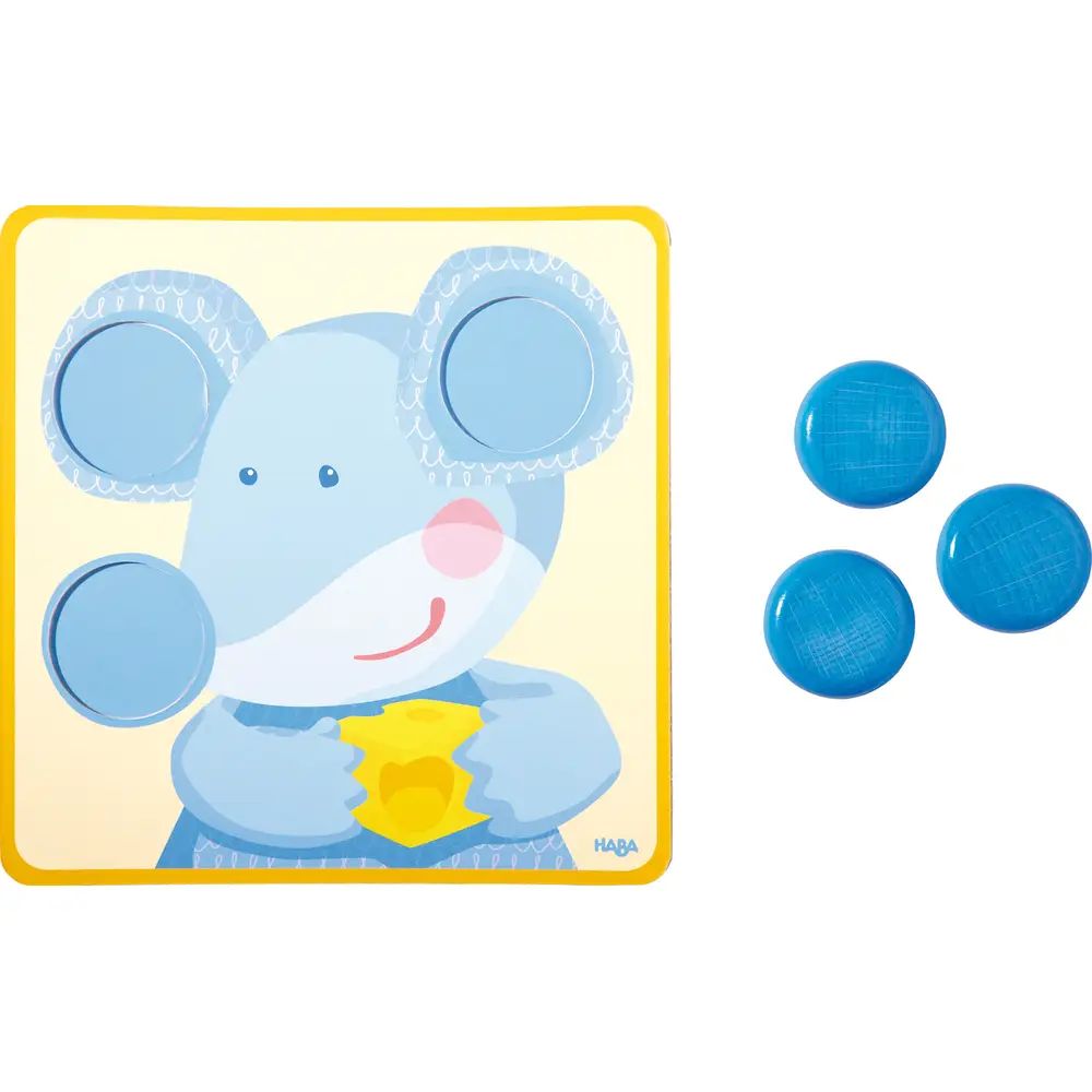 Quelle est la couleur des oreilles de la souris ? Quelles plaquettes doit-on poser pour les ailes du papillon ? Les enfants classent les couleurs en posant les plaquettes dans les découpes des plateaux. Ils peuvent bien sûr aussi parer les animaux de gros points multicolores.