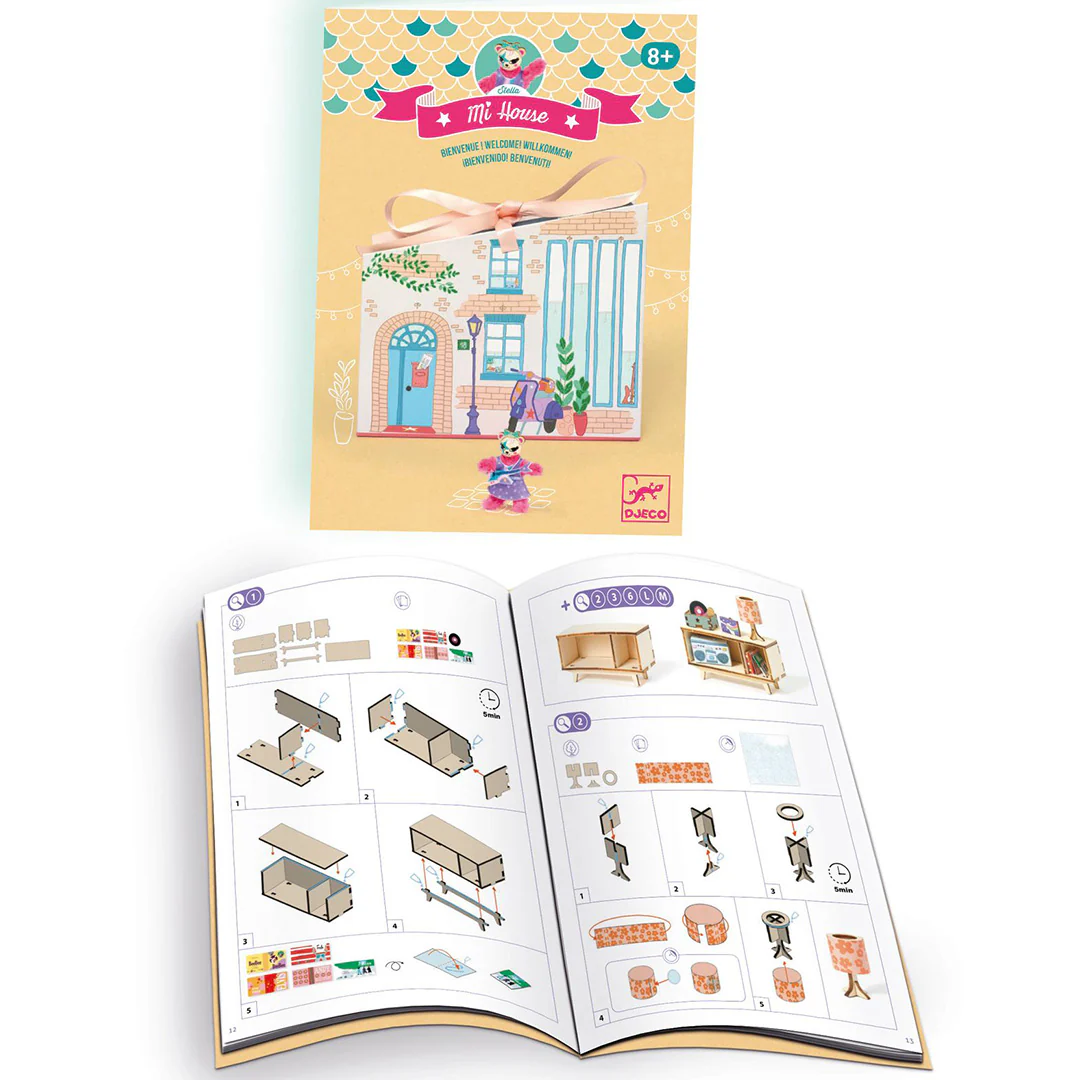À l’intérieur : un vrai petit trésor ✨ → du mobilier en bois à assembler, des éléments pour créer son personnage, de la feutrine toute douce, de la peinture avec son pinceau, des autocollants… bref, tout pour donner vie à un univers miniature plein de magie 🏡💖