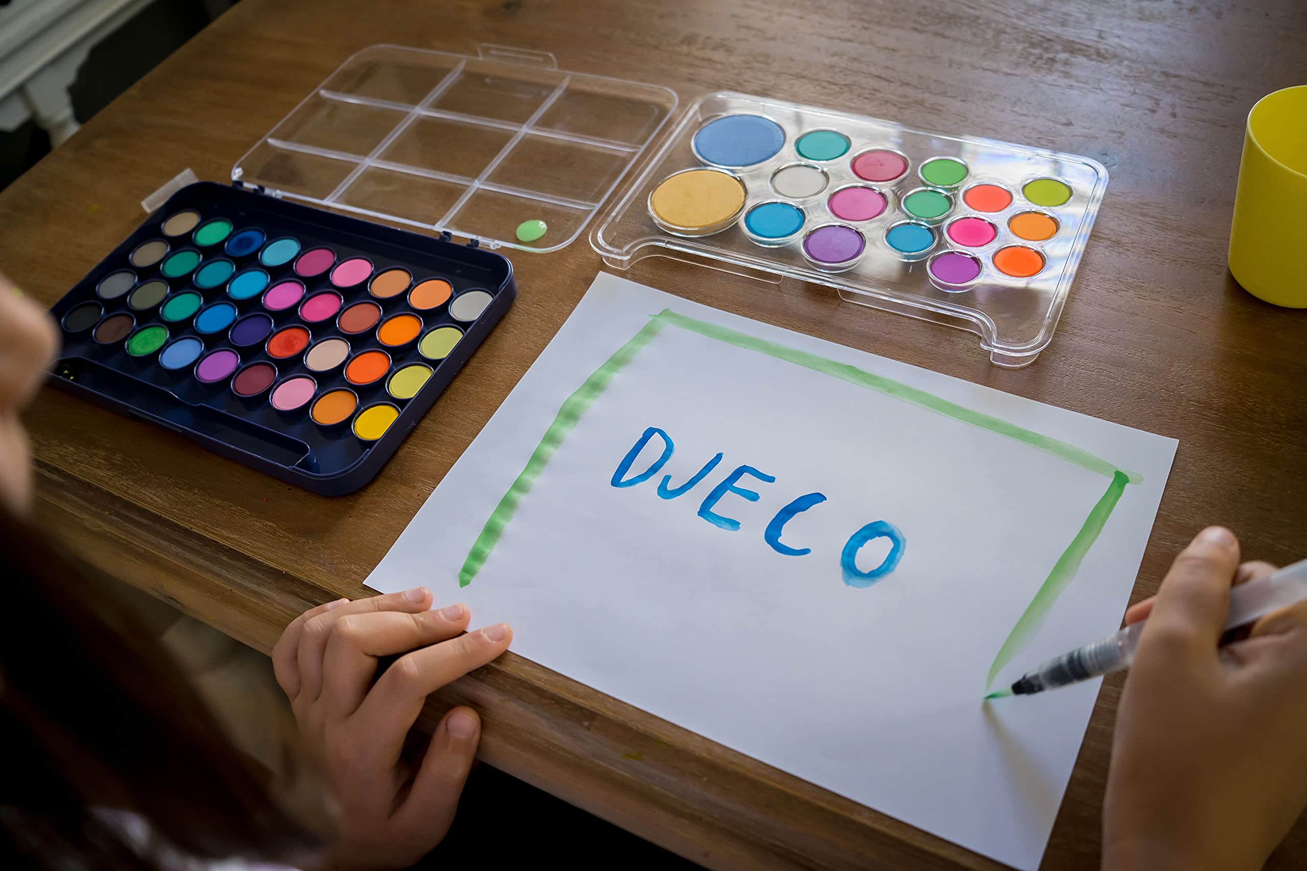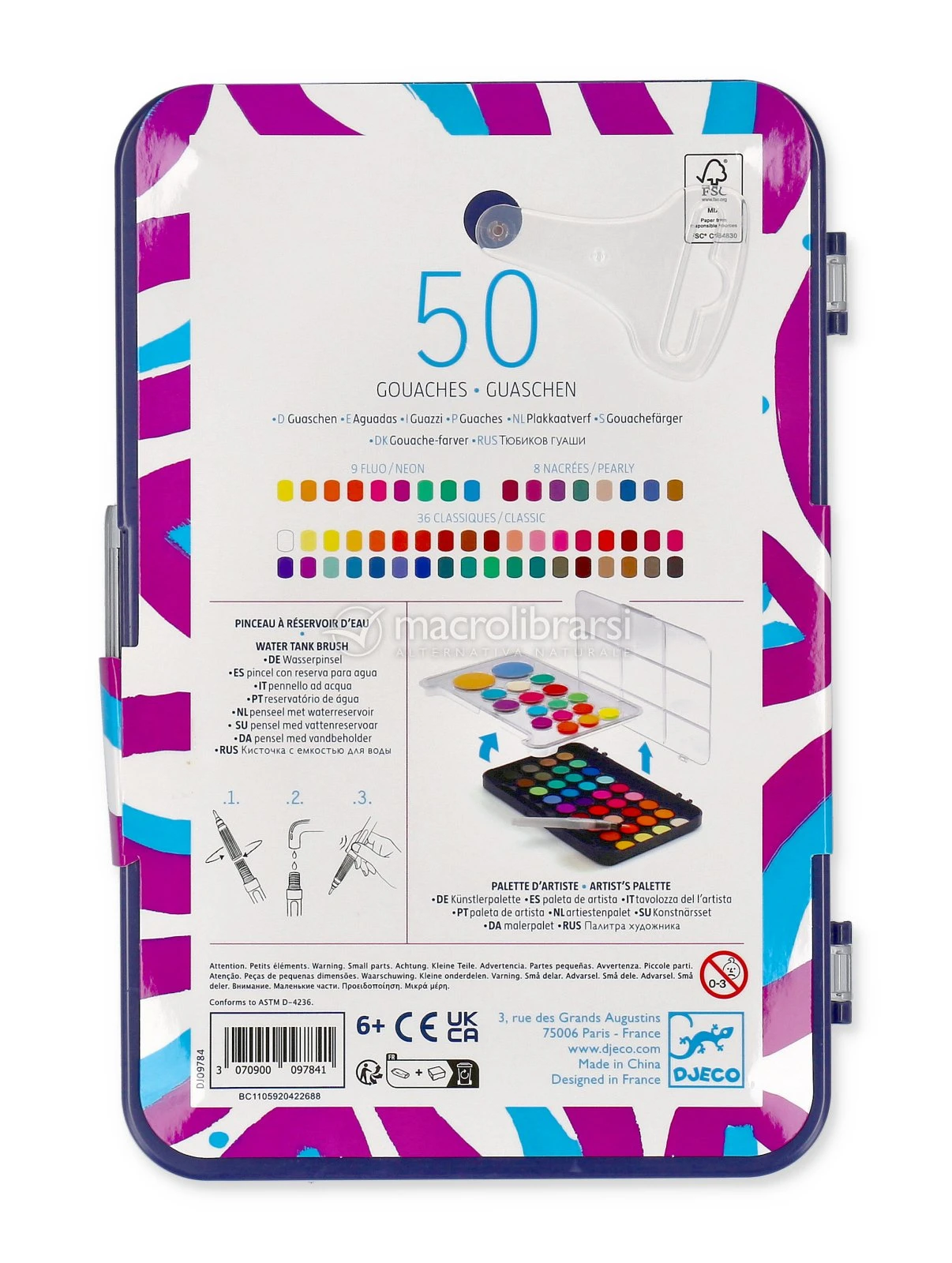Jolie palette d’artiste peintre avec 53 gouaches (36 teintes classiques, 8 teintes nacrées et 9 couleurs fluos) et 1 pinceau à réservoir d’eau.