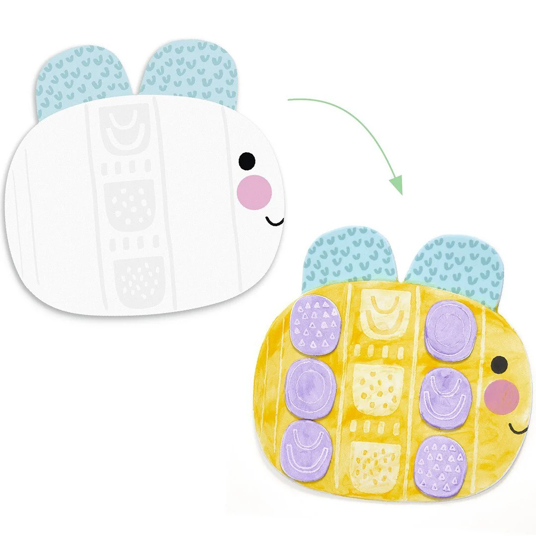 Quelques gouttes de peinture… pour colorer les animaux avec les doigts. Magique, de petits motifs apparaissent ! L’enfant place les autocollants pour rendre les animaux encore plus beaux !