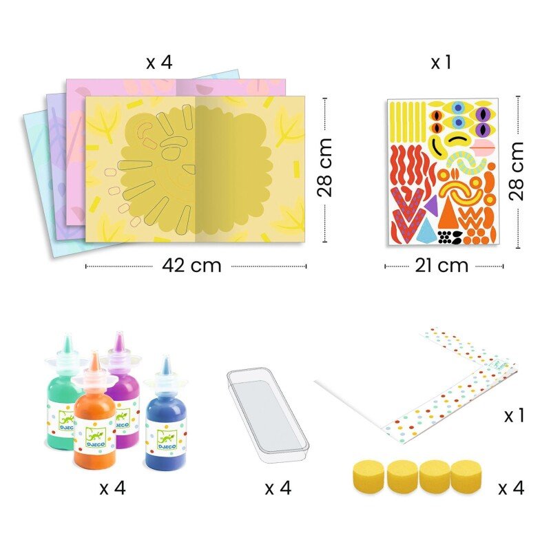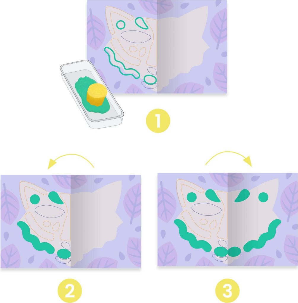 L’enfant dépose la peinture d’un côté puis il replie la feuille. Il la lisse et oh, surprise ! Il la décore ensuite avec des stickers.