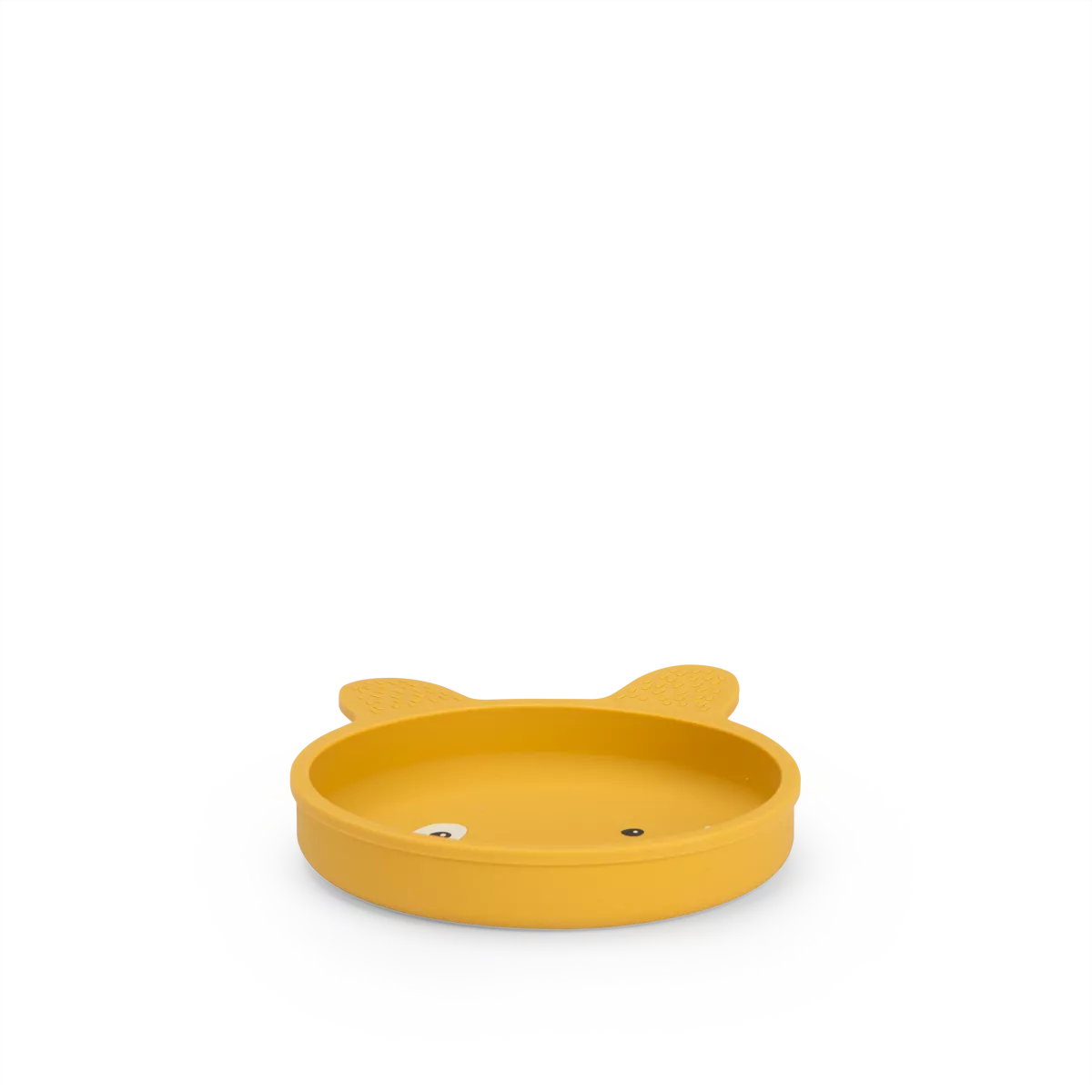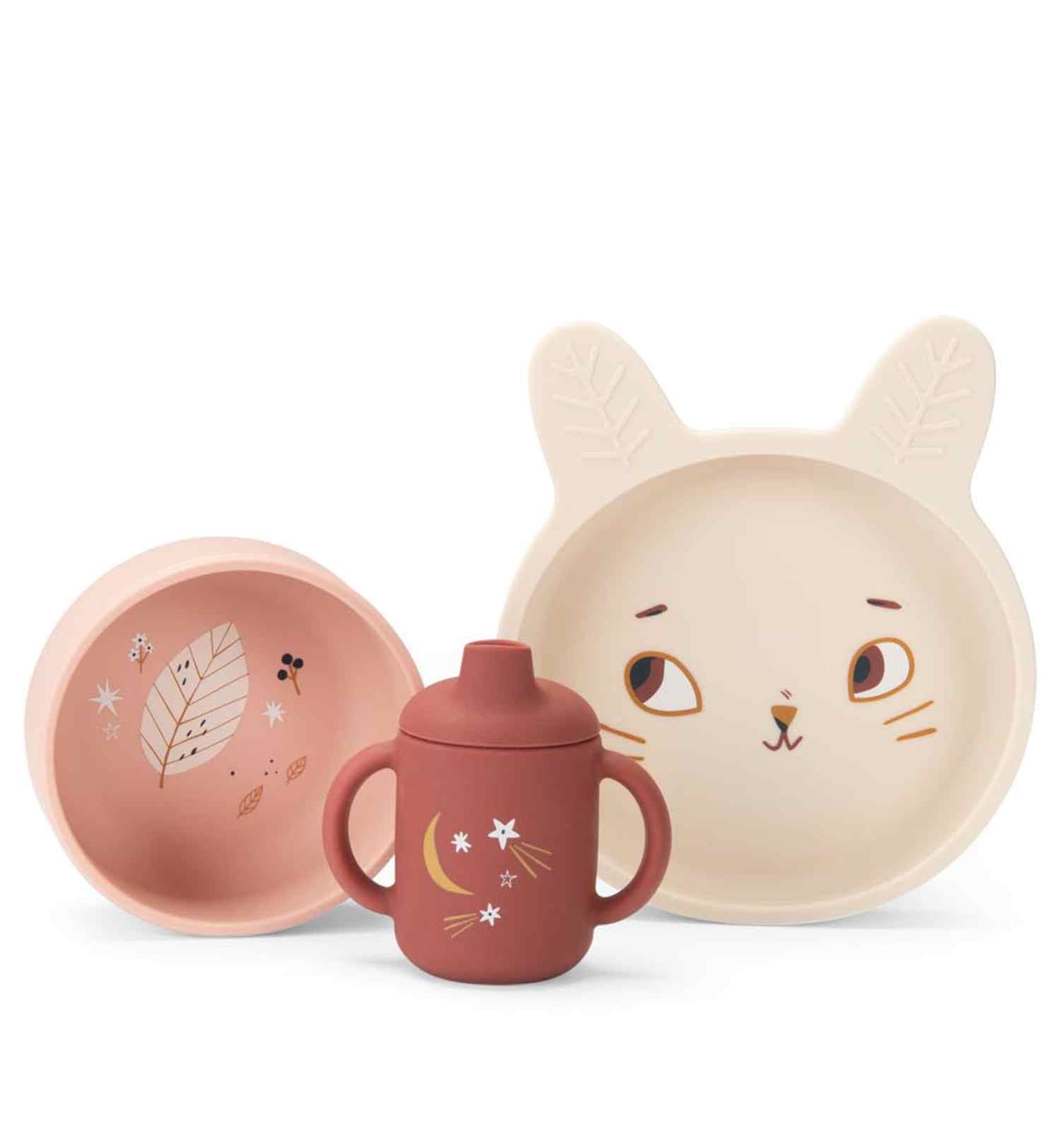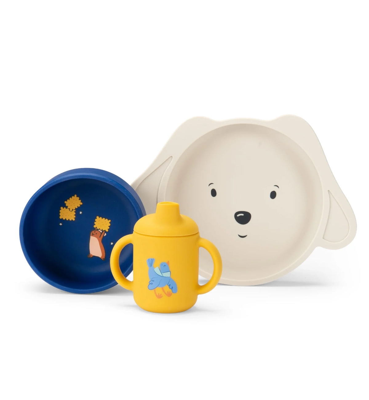 Coffret vaisselle en silicone, tendrement illustré pour manger comme les grands. Comprend bol, tasse à anses et assiette. Passe au lave-vaisselle