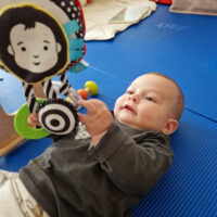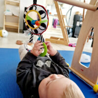 Je vous conseille aussi ces jouets à suspendre qui sont bien utilisés quand bébé ne sait pas encore prendre un objet ( 4 mois) mais peut déjà diriger sa main et le faire balancer.