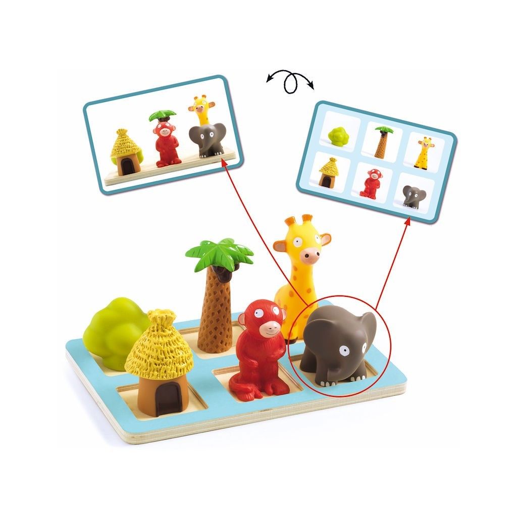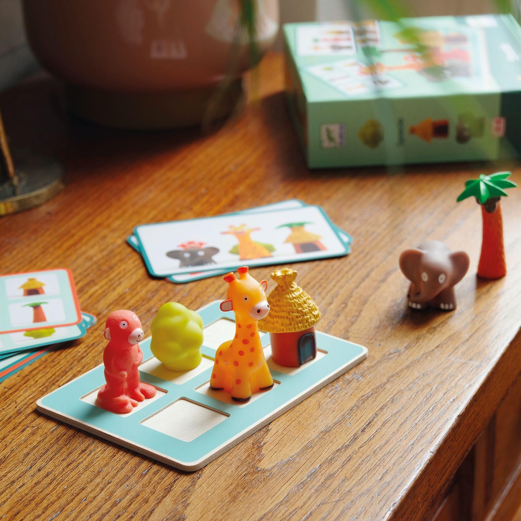 Pour reproduire la photo, l’enfant doit placer correctement les figurines sur le plateau. Solutions au dos des cartes.