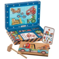 Ce n’est pas pour rien que ce type de jouets traverse les générations 🙂 ! Vous trouverez dans ces boites la plaque en liège, le marteau en bois, 10 modèles différents, 25 pièces à fixer et 40 clous.