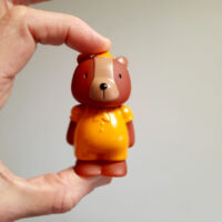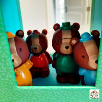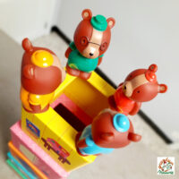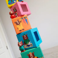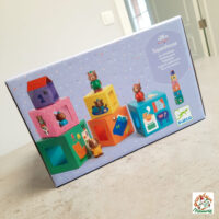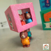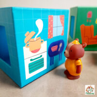 » Je prends une boite, je mets un figurine dedans, je secoue, je renverse la boite, j’aligne les personnages, je les fais passer par les trous, je superpose les cubes, je mets en bouche bien sûr, je me promène avec une figurine dans chaque main, je regarde les images, je reconnais les objets illustrés, je raconte des histoires…. »