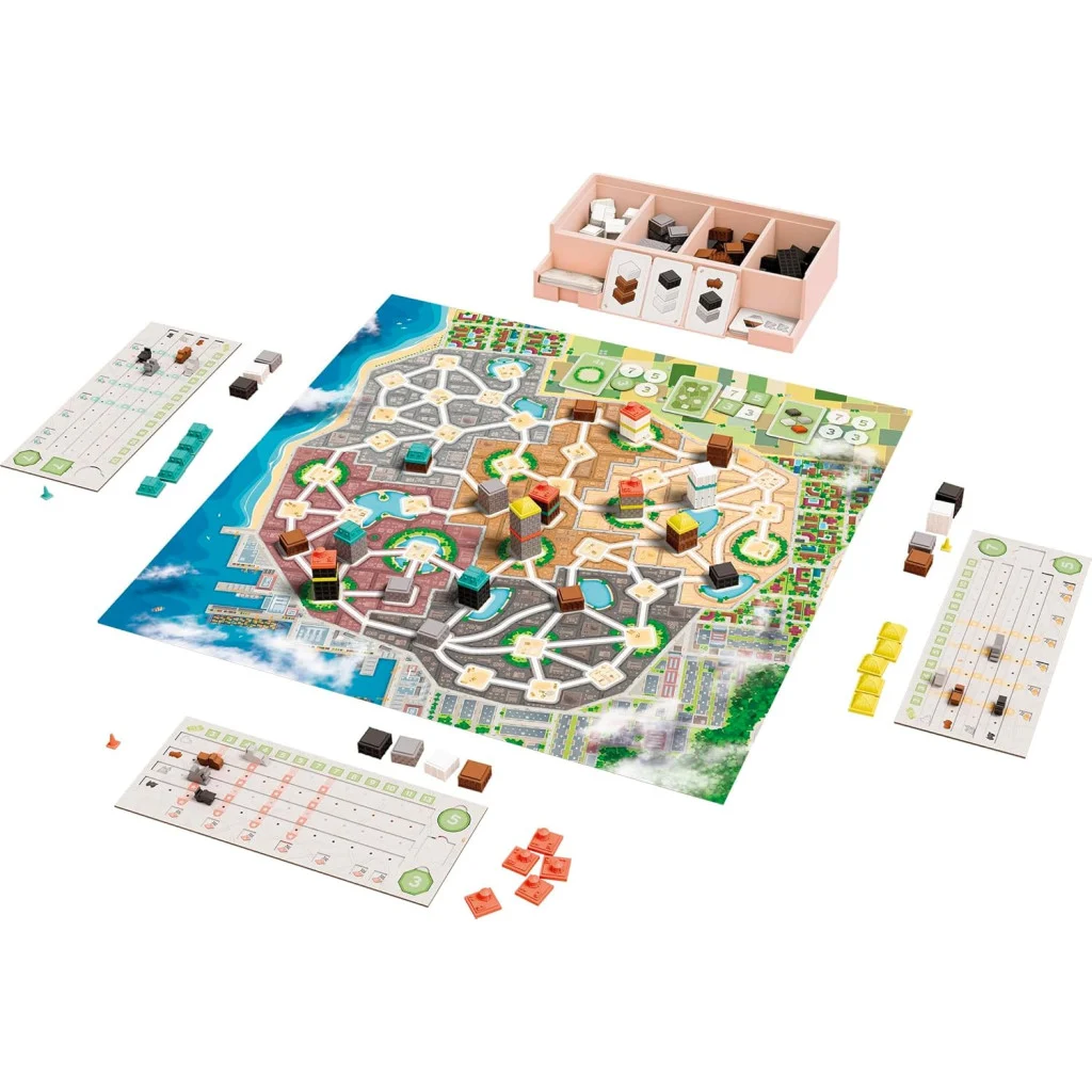 – utiliser vos ressources pour construire un nouveau bâtiment : choisissez un emplacement vide, payez le coût des bâtiments adjacents, placez un toit et gagnez les points correspondants..