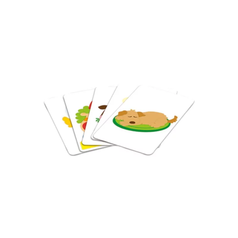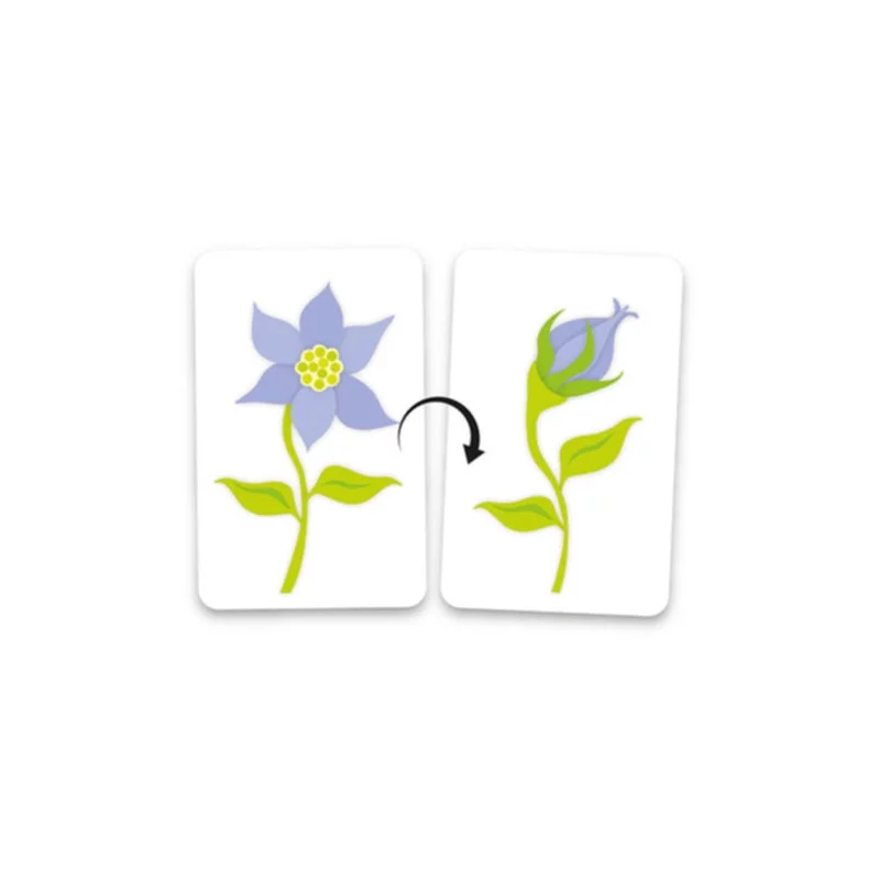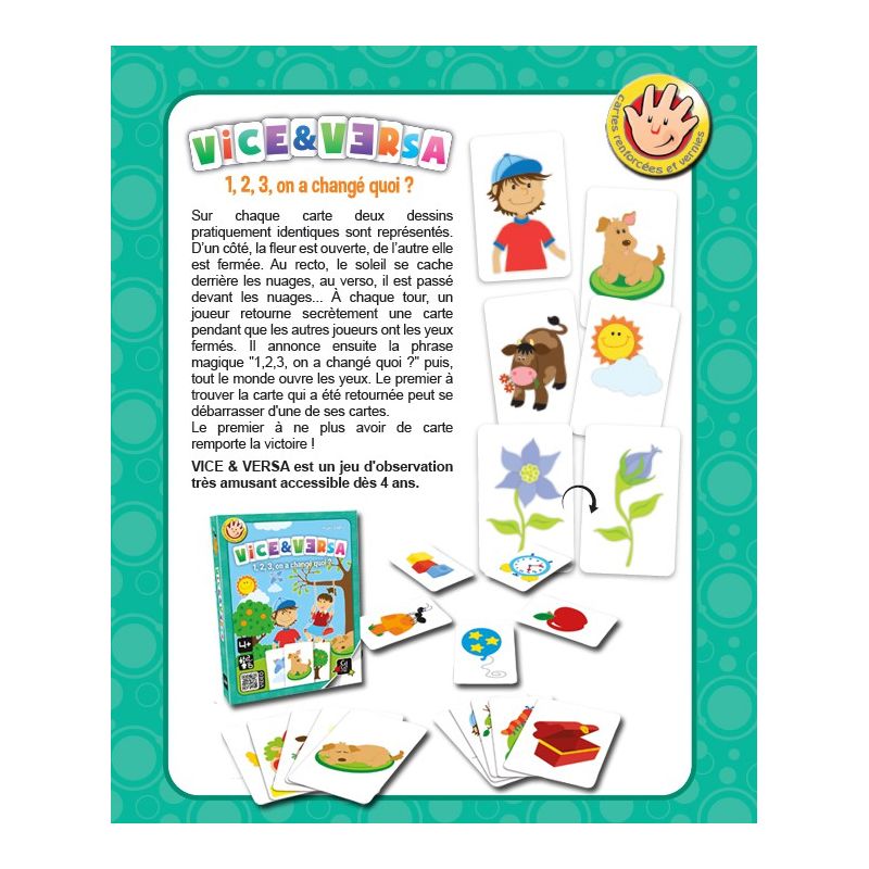 Sur chaque carte deux dessins pratiquement identiques sont représentés. D’un côté, la fleur est ouverte, de l’autre elle est fermée. Au recto, le soleil se cache derrière les nuages, au verso, il est passé devant les nuages… À chaque tour, un joueur retourne secrètement une carte pendant que les autres joueurs ont les yeux fermés. Il annonce ensuite la phrase magique « 1,2,3, on a changé quoi ? » puis, tout le monde ouvre les yeux. Le premier à trouver la carte qui a été retournée peut se débarrasser d’une de ses cartes. Le premier à ne plus avoir de carte remporte la victoire !